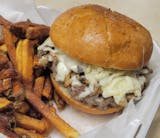 Fresh steak topped with cheese on a toasted bun. Served wirh fries